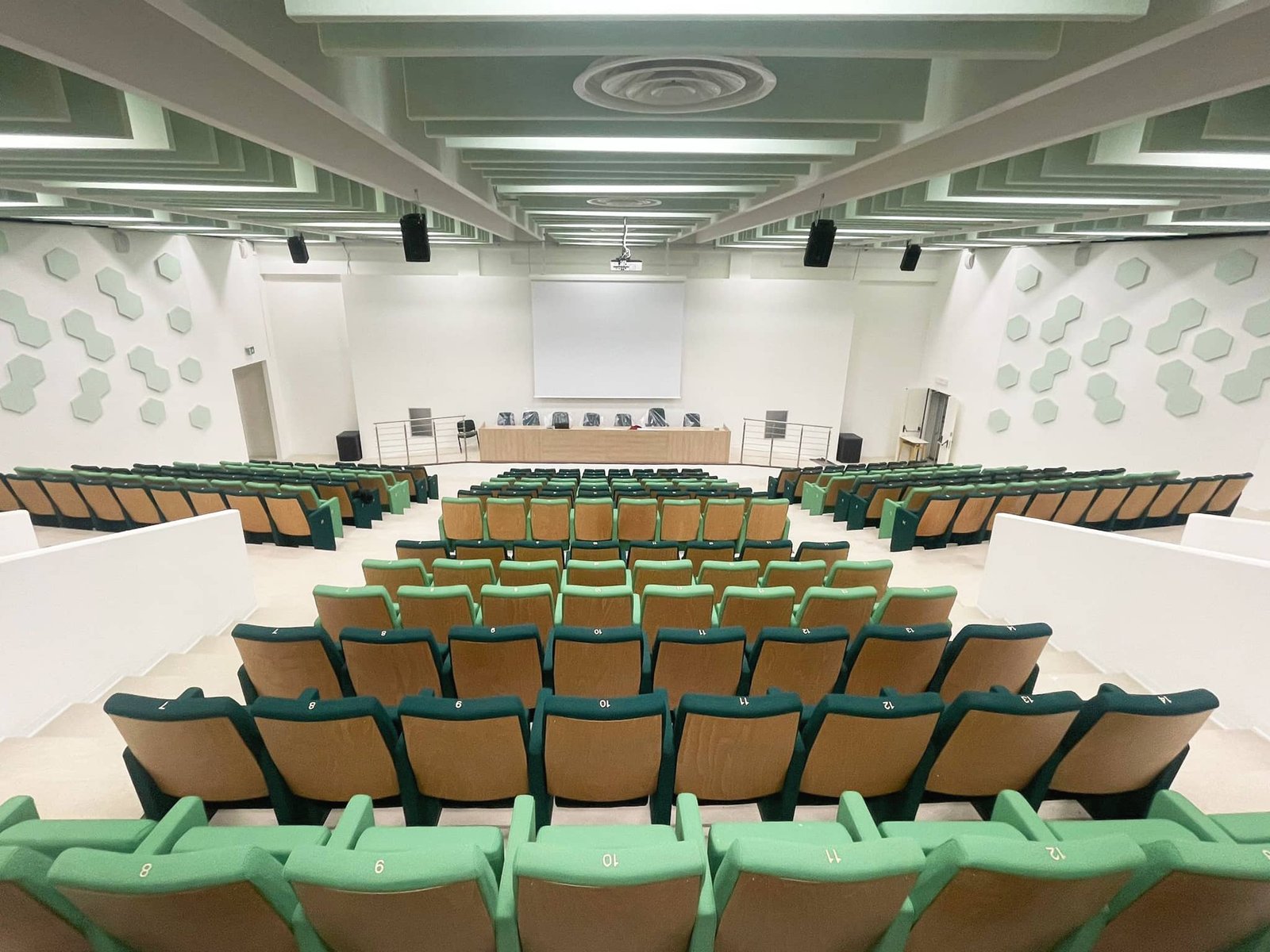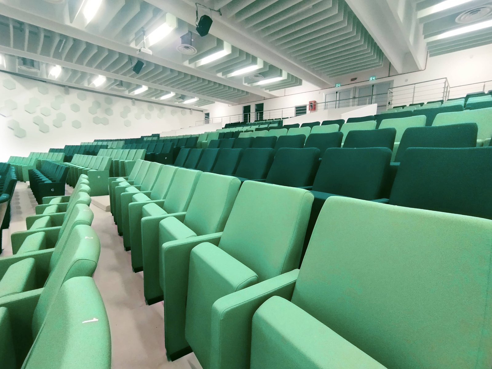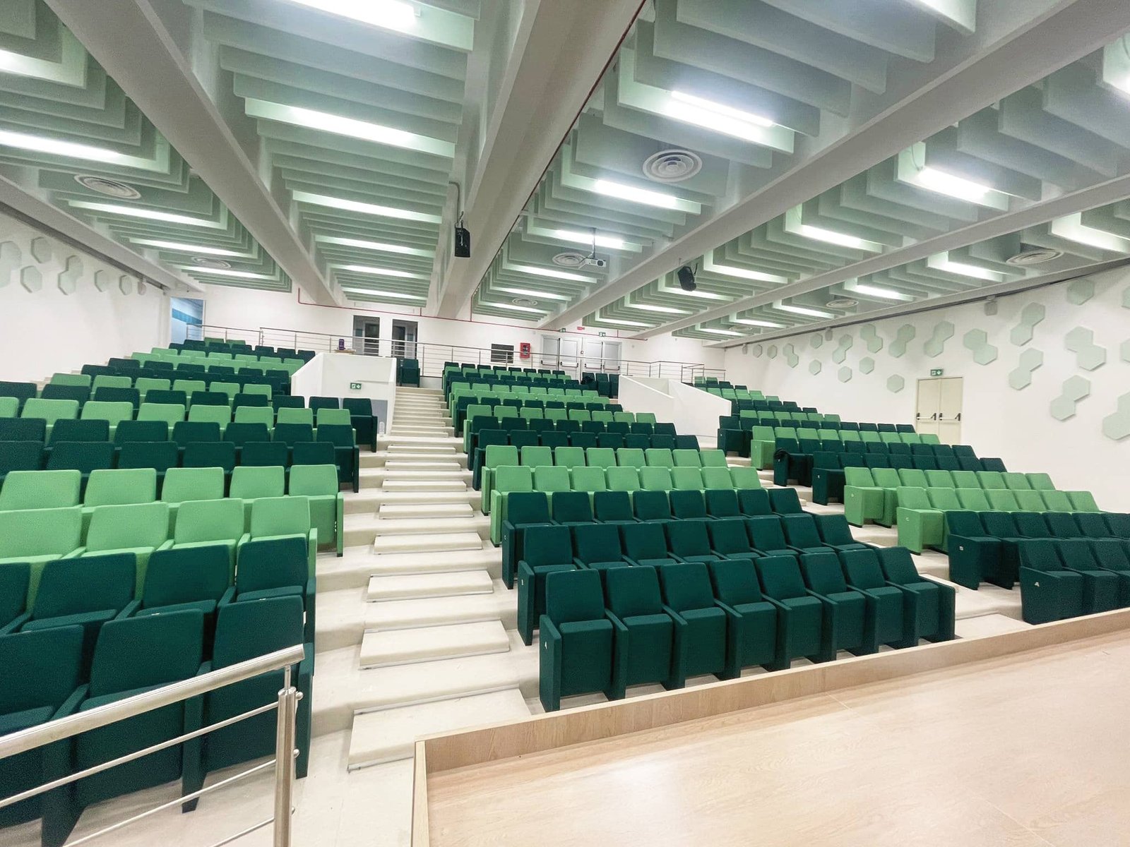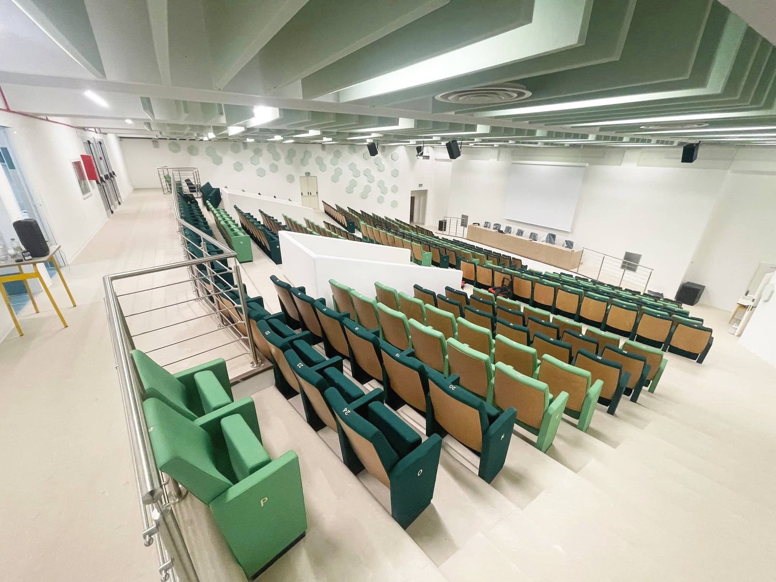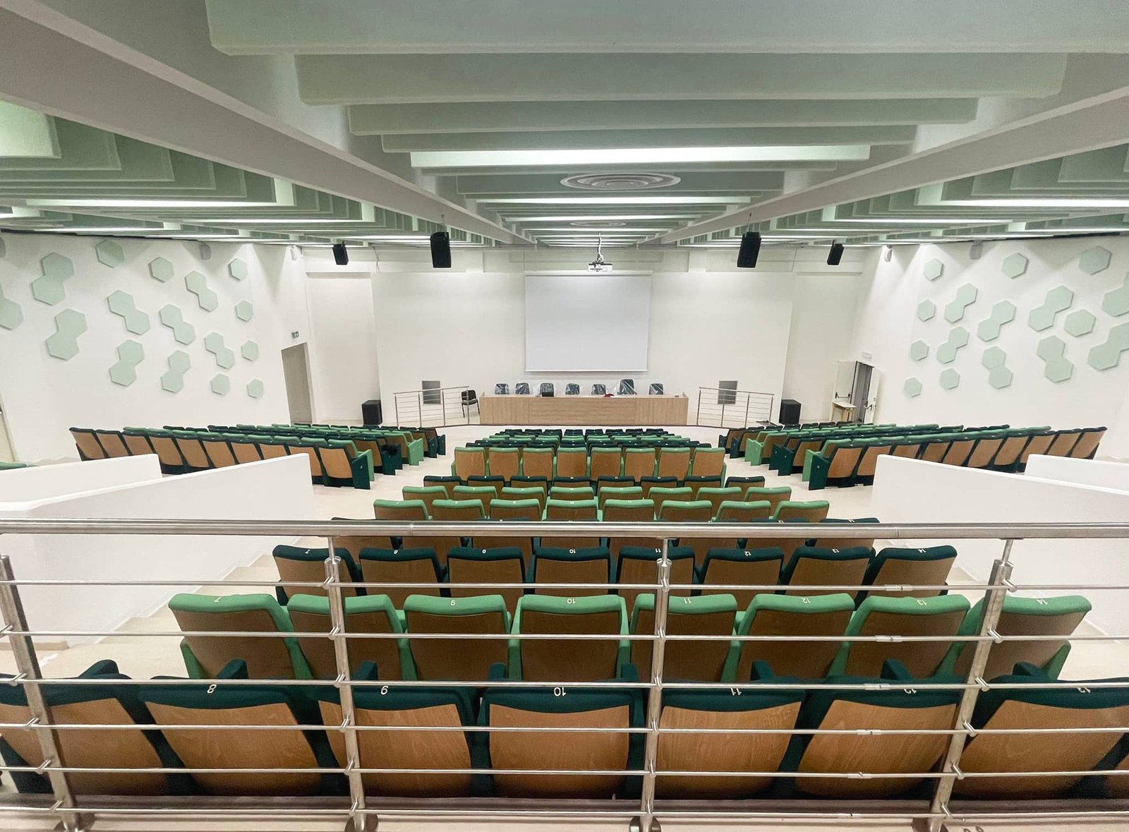 The project also included the supply of additional versatile school auditorium seats, such as the Musa SP model, designated for the foyer and the speakers’ table, as well as the installation of stainless steel balustrades positioned alongside the speakers’ table and in the upper part of the hall.