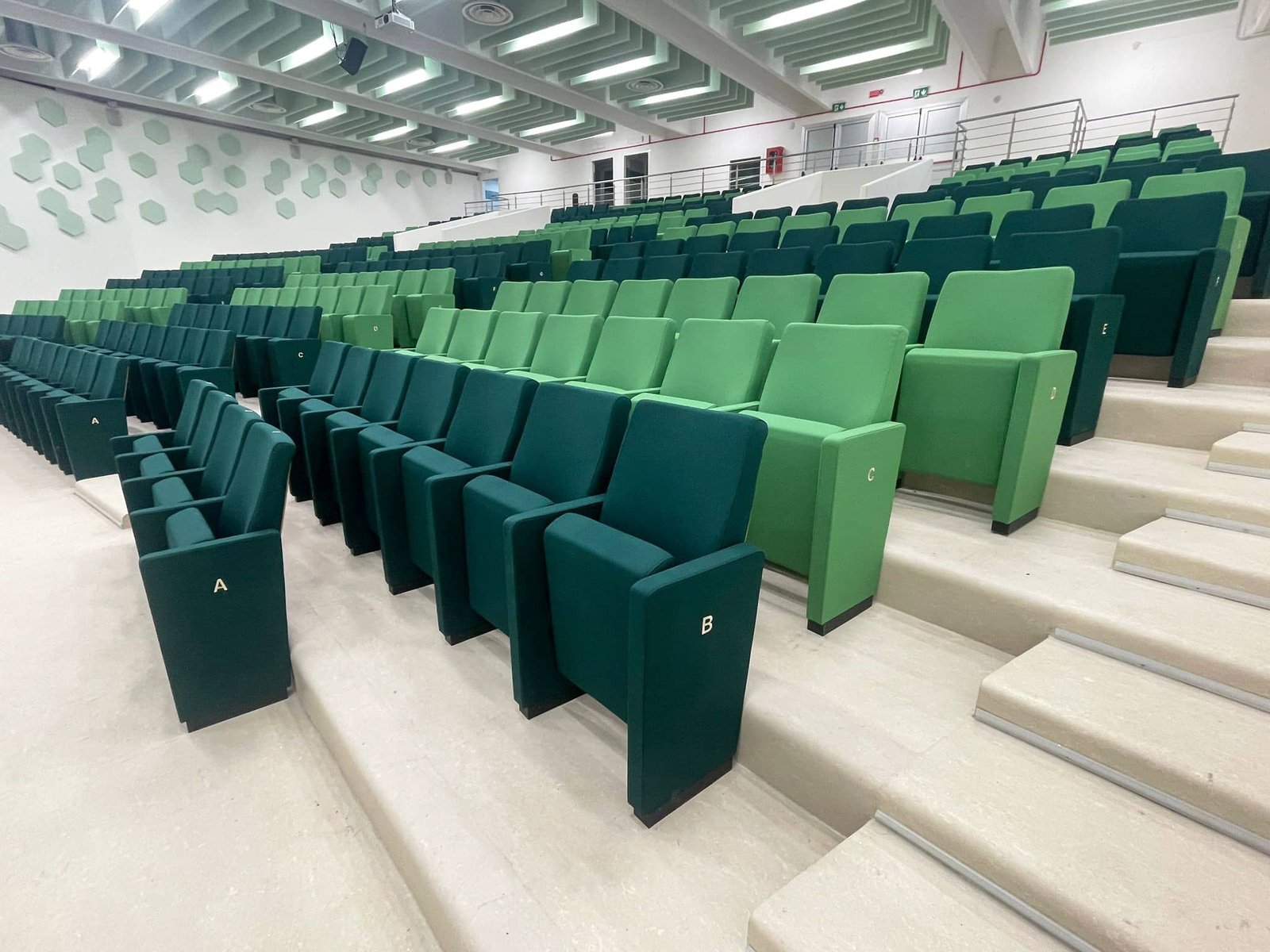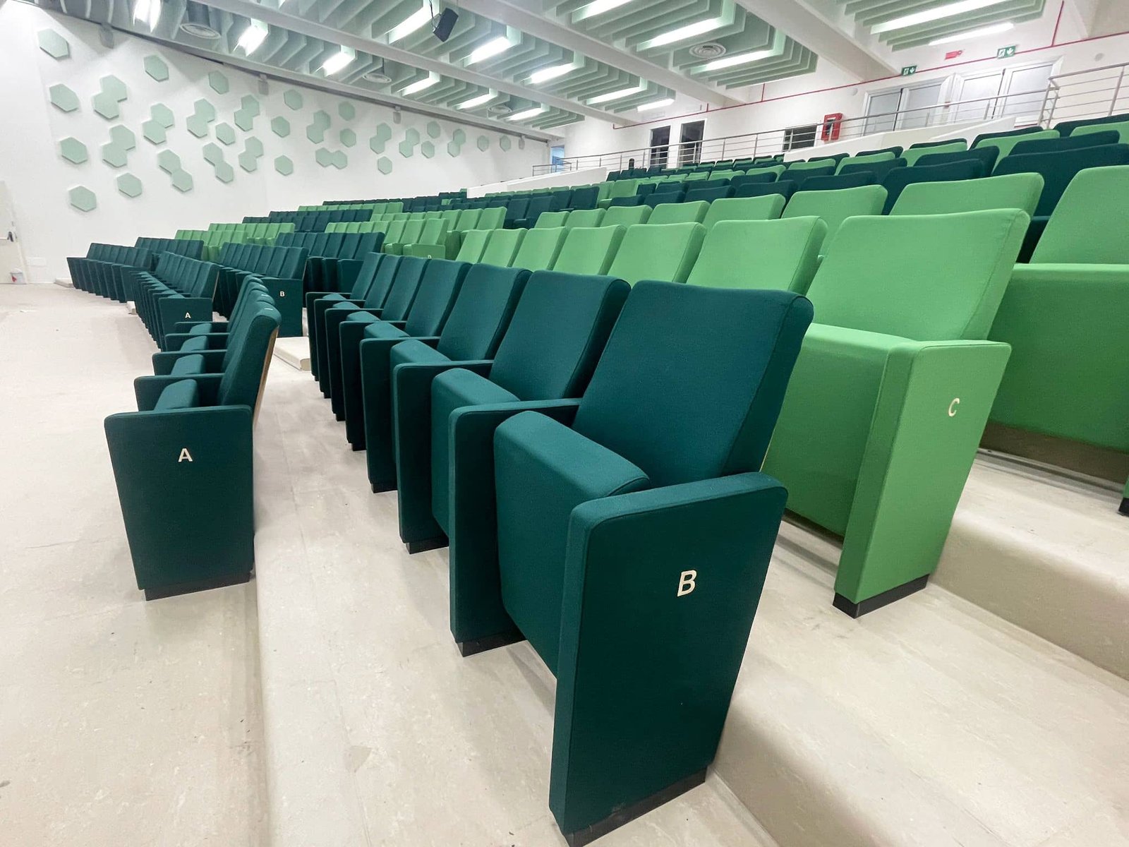 A total of 339 Omega armchairs were installed, upholstered in high-strength fire retardant fabric in two shades of green, complete with seat and row numbering and oak-stained beech back protective cover. A solution designed to ensure comfort, visual order and durability in high-traffic environments such as magic classrooms, conference rooms and school event spaces.