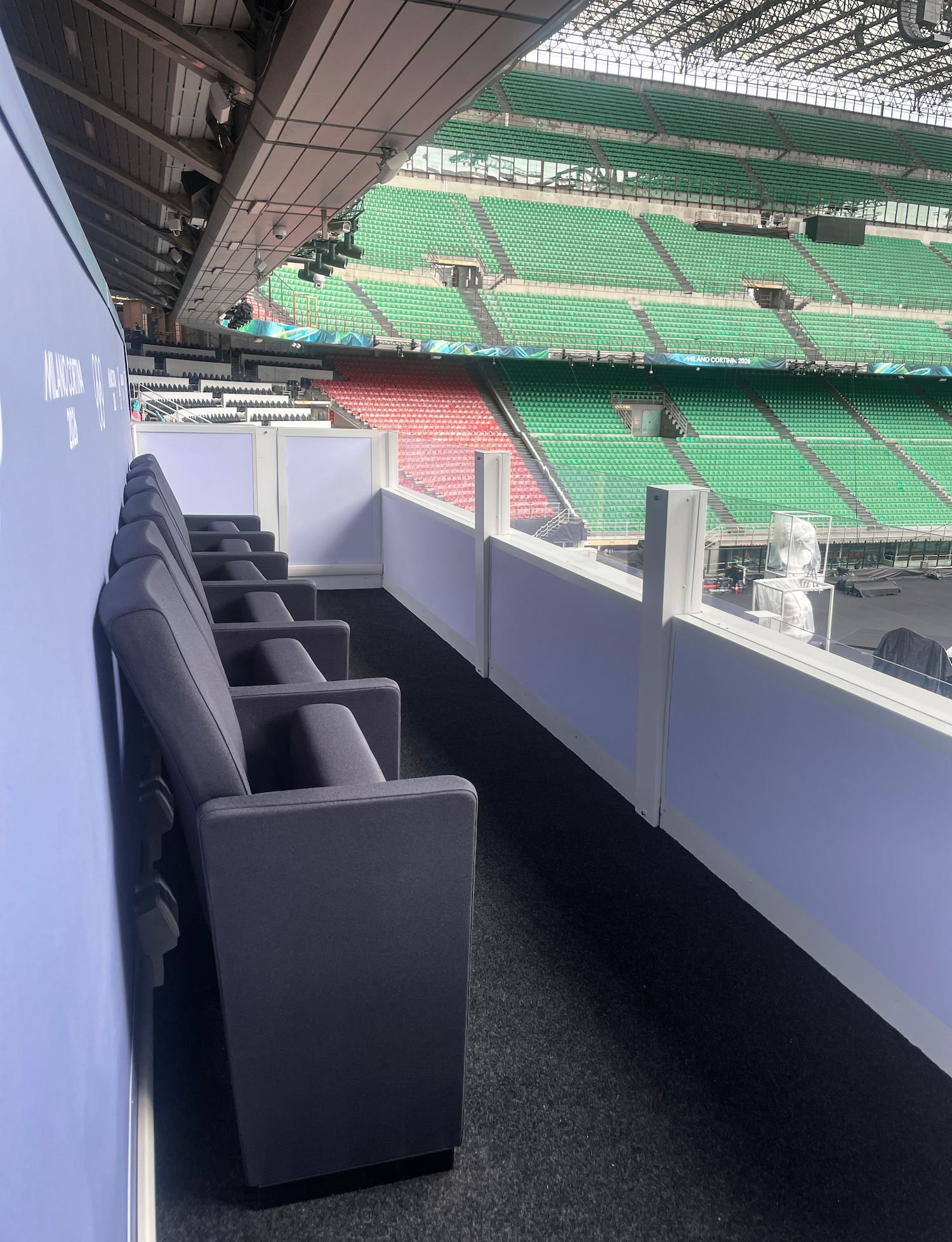 Un intervento dedicato alle sedute da stadio e alle poltrone per tribune VIP, progettato per rispondere alle esigenze di comfort, sicurezza e rapidità di installazione tipiche dei grandi eventi sportivi.